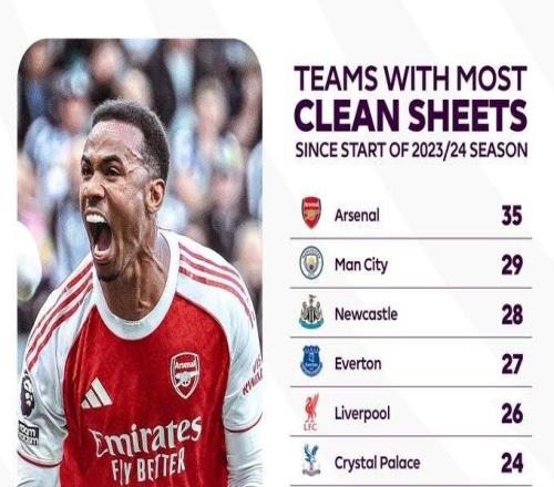 2025-10-10英超官方列出了自2023-24赛季以来英超球队零封场次排行榜,阿森纳以35场居首,曼城第二,利物浦第五。自2023-24赛...