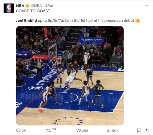 恩比德还完成了一次持球推进反击上篮,身体状态非常不错,上半场恩比德已经拿到9分7助攻5篮板3抢断的全面数据,健康的恩比德依旧是联盟最顶级的球员。