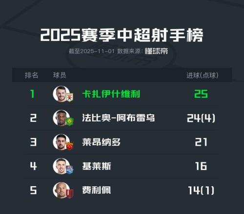 中超第29轮,瓦科破门+失点,法比奥双响,两人进球数分别来到25粒和24粒,射手榜第三名的莱昂纳多攻入21球,争夺金靴的可能性不大。