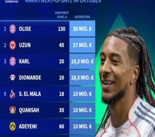 雷速体育10月14日宣 北京时间10月14日德国转会市场更新了最新一期德甲身价,拜仁慕尼黑攻击手奥利塞身价暴涨...